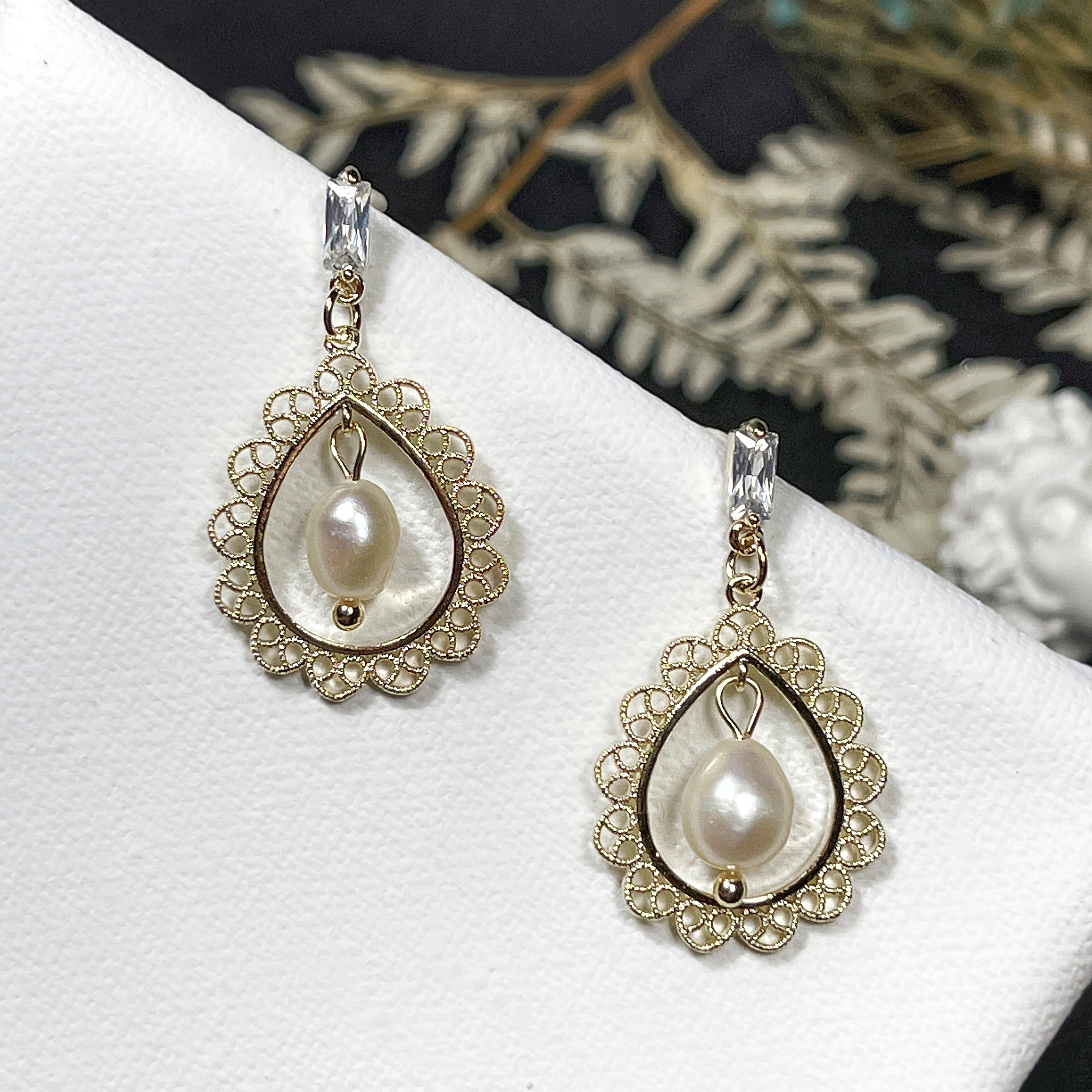 【 淳飾 】銀針|復古簍空珍珠垂墜 12161902